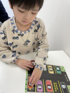 楽しく個別課題を行います。写真のように数字のところに車を駐車させたり、