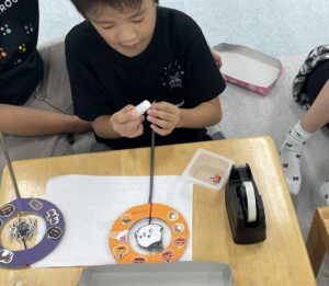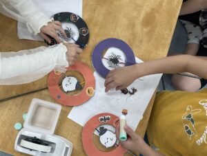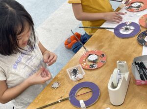 このステッキは、ただのステッキではなく、円の中央のおばけや蜘蛛がクルクル回る仕掛けになっています。ほんの少し、仕掛けがあるだけで「作りたい!」という制作威力が高まります。作った後で、遊べる工作は楽しいですよね。