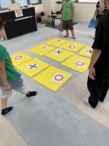 栗生教室では、毎週土曜日と祝日、夏休みなどの長期休暇には音楽養育の後にお弁当を食べてから午後の活動があります。今回は、マル・バツ・ゲームを行いました。