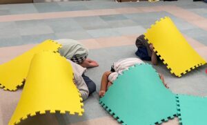 画像は窓から離れた場所まで移動し、頭部を守っている様子です。「だんごむしだよー。」と練習した通りマットで頭部を守る事ができました。皆さん緊張感を持ち、行動する事ができました👏