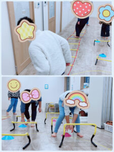 ハードル越えでは、足をしっかり上げたりしゃがんでコーンをタッチします👣