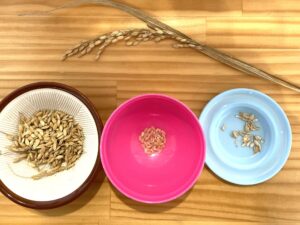 稲穂🌾から外して、殻を剥き、玄米になるまでを学びました♪