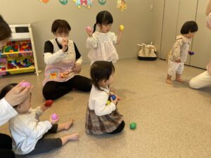 音楽や絵本に合わせて体を自由に動かしたり、たまご型のマラカスでシャカシャカ音をならしてみたり、みんな様々な表現の仕方がありました!!
