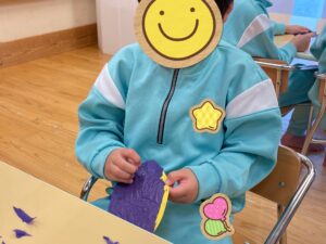紫色のお花紙をむくと、下からきれいな黄色が見えてきて、「本当のサツマイモみたい」とびっくりした様子の子ども達。