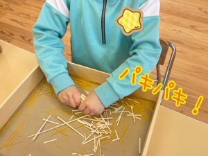 小さく折ってみたり、まとめてバキンと折ってみたり、箱に集めた物をかき混ぜてみたり…。